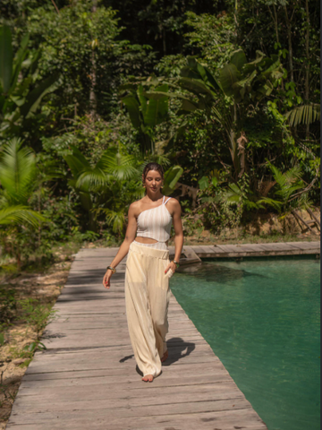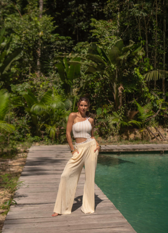 * Calça pantalona com elástico na cintura, bem ampla, contém bolsos.