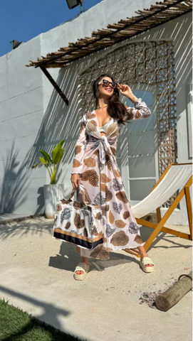 A saída de praia é uma saída longa, desenvolvida em tecido tule com bastante elastano, super confortável, toque suave no corpo, fresca e perfeita para o Verão, uma peça que te permite diversas amarrações diferentes.